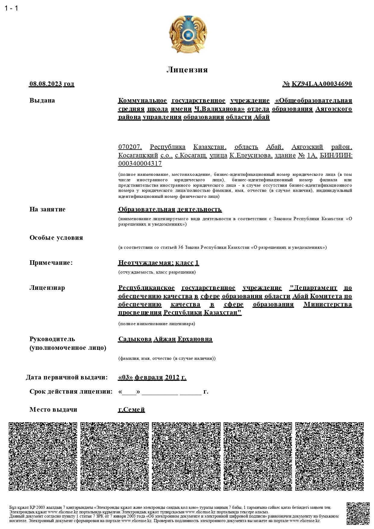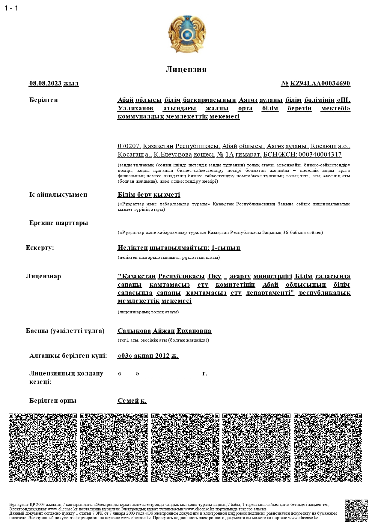 Абай облысы білім басқармасының Аягөз ауданы білім бөлімінің «Ш. Уәлиханов атындағы жалпы орта білім беретін мектебі» коммуналдық мемлекеттік мекемесі ЛИЦЕНЗИЯ