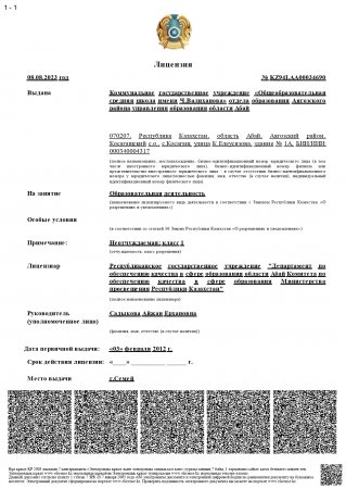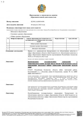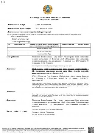 » Абай облысы білім басқармасының Аягөз ауданы білім бөлімінің «Ш. Уәлиханов атындағы жалпы орта білім беретін мектебі» коммуналдық мемлекеттік мекемесі ЛИЦЕНЗИЯ