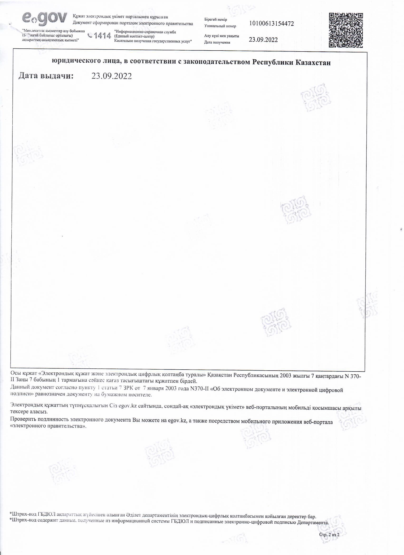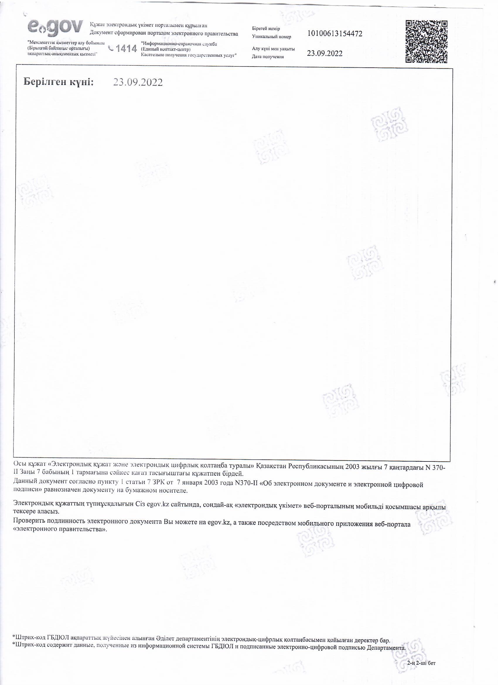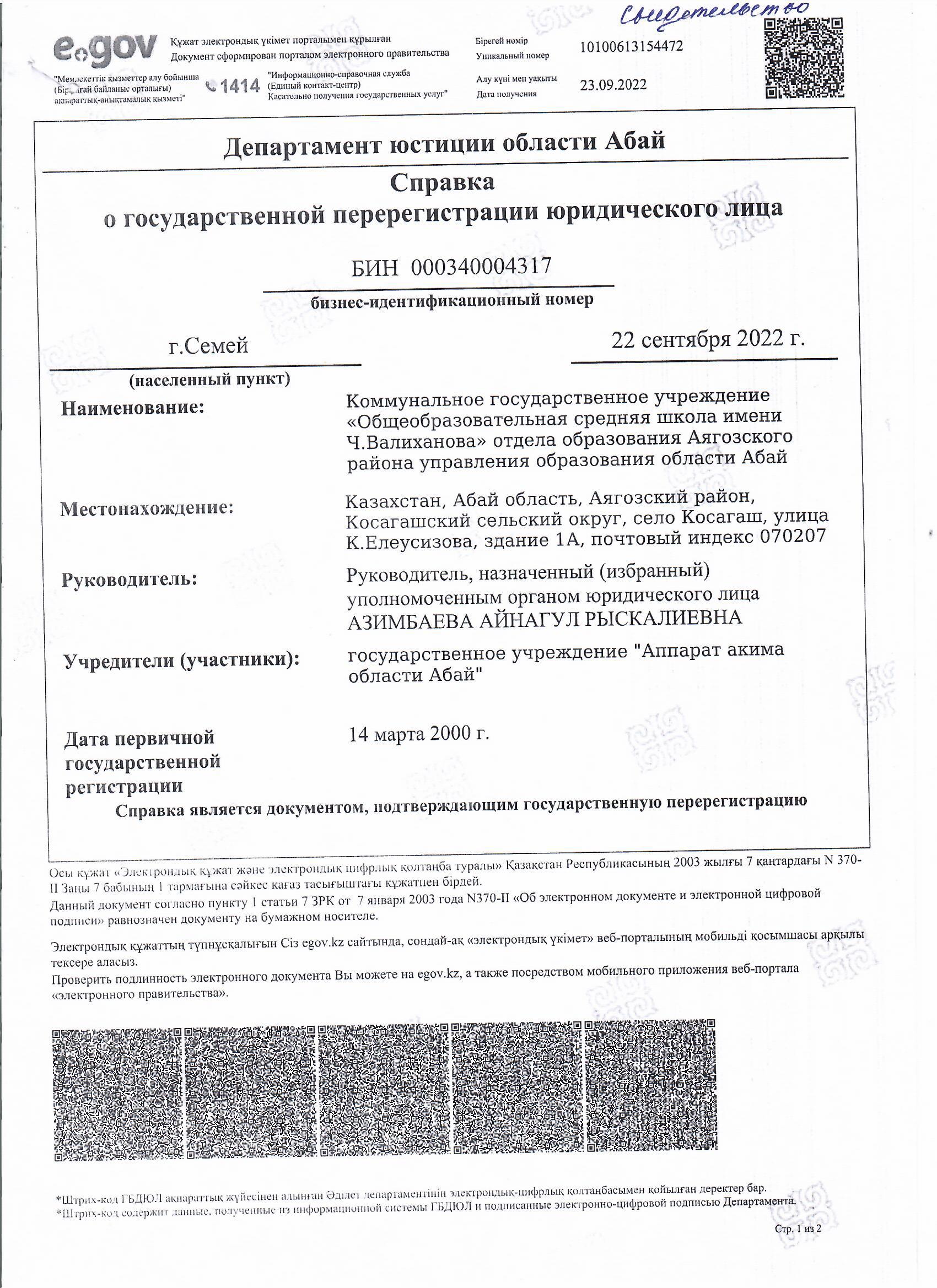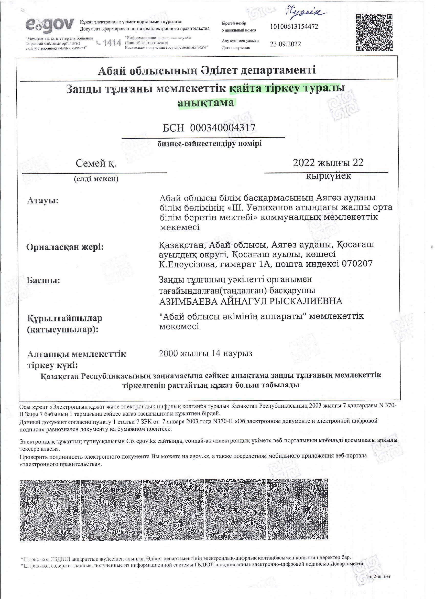 » Абай облысының Әділет департаменті Заңды тұлғаны мемлекеттік қайта тіркеу туралы анықтама