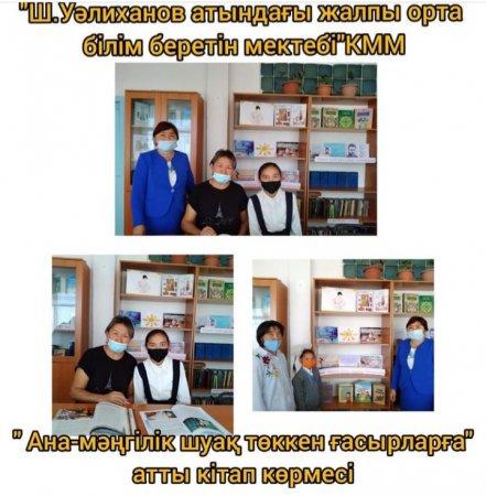 "Ш.Уəлиханов атындағы жалпы орта білім беретін мектебі "коммуналдық мемлекеттік мекемесі 2021 жылдың 19 қыркүйегінде Қазақстандық аналар күніне арналған "Ана- мəңгілік шуақ төккен ғасырларға "атты кітап көрмесі ұйымдастырылды.Мектеп кітапханашысы:Ерубаева Гулжан Аменовна