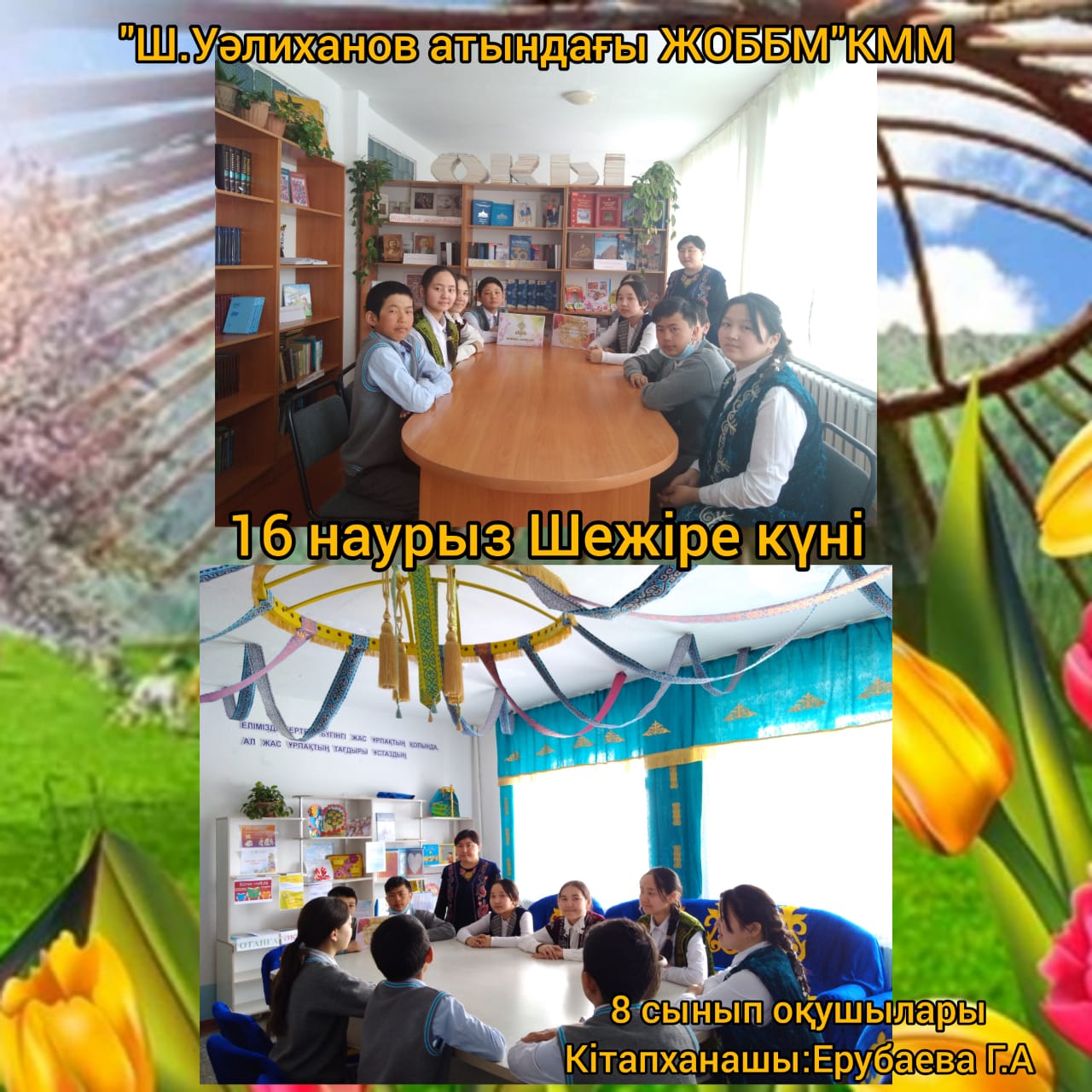 16 наурыз – Шежіре күні. Бұл күні отбасының, ел-жұрттың, жеті атаның тарихы айтылып, шежіресі таратылады. Шежіре күніне орай мектеп кітапханасында Ерубаева Гулжан Аменовна 8 сынып оқушыларымен қазақ халқының ру атауларына қатысты тəрбие сағатын өткізді