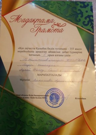 28 қазан күні Сарықамыс ауылындағы «М.Әбеулов атындағы жалпы орта білім беретін мектебі» кмм де «Қаз дауысты Қазыбек бидің туғанына 355 жыл» мерейтойына арналған аймақтық дебат турнирі өтті. Біздің мектептен қатысқан «Лидер» командасы жүлделі ІІ орын иеленді. Команда спикерлері Азкей Д бен Сембеков Қ