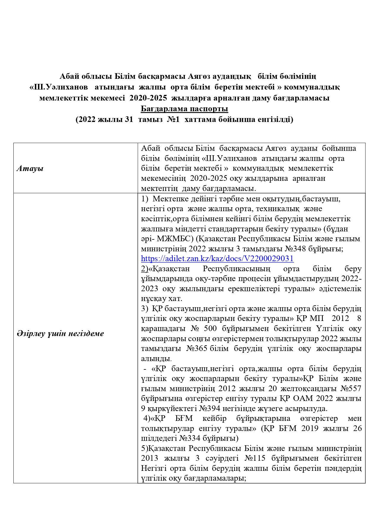 Абай облысы білім басқармасының Аягөз ауданы білім бөлімінің «Ш. Уәлиханов атындағы жалпы орта білім беретін мектебі»