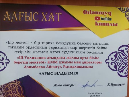 "Бір мектеп-бір тарих" байқауына белсене қатысып, тағылым ордасының тарихынан сыр шертетін бейне түсірілім жасаған Аягөз ауданы білім бөлімінің "Ш. Уәлиханов атындағы жалпы орта білім беретін мектебі" КММ ұжымы мен директоры Азимбаева Айнагүл Рысқалиқызына алғыс хат пен Ғабиден Құлахметтің 2 томдық кітабы сыйға берілді.