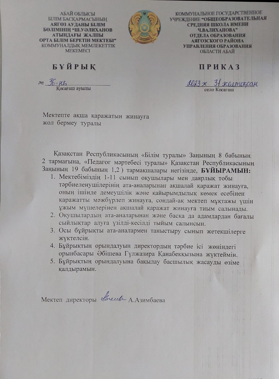 Мектепте ақша қаражатын жинауға жол бермеу туралы бұйрық