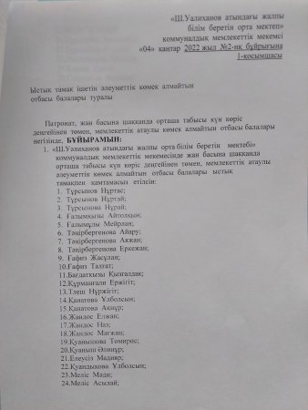 2021-2022 оқу жылына әлеуметтік қорғалмаған және аз қамтылған отбасылардан шыққан мектеп оқушыларын тегін ыстық тамақпен қамтамасыз ету туралы