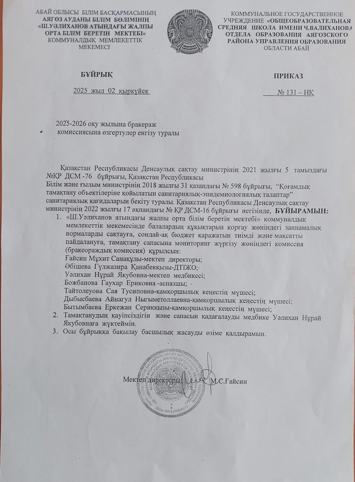 » Бракераж комиссиясының бұйрығы