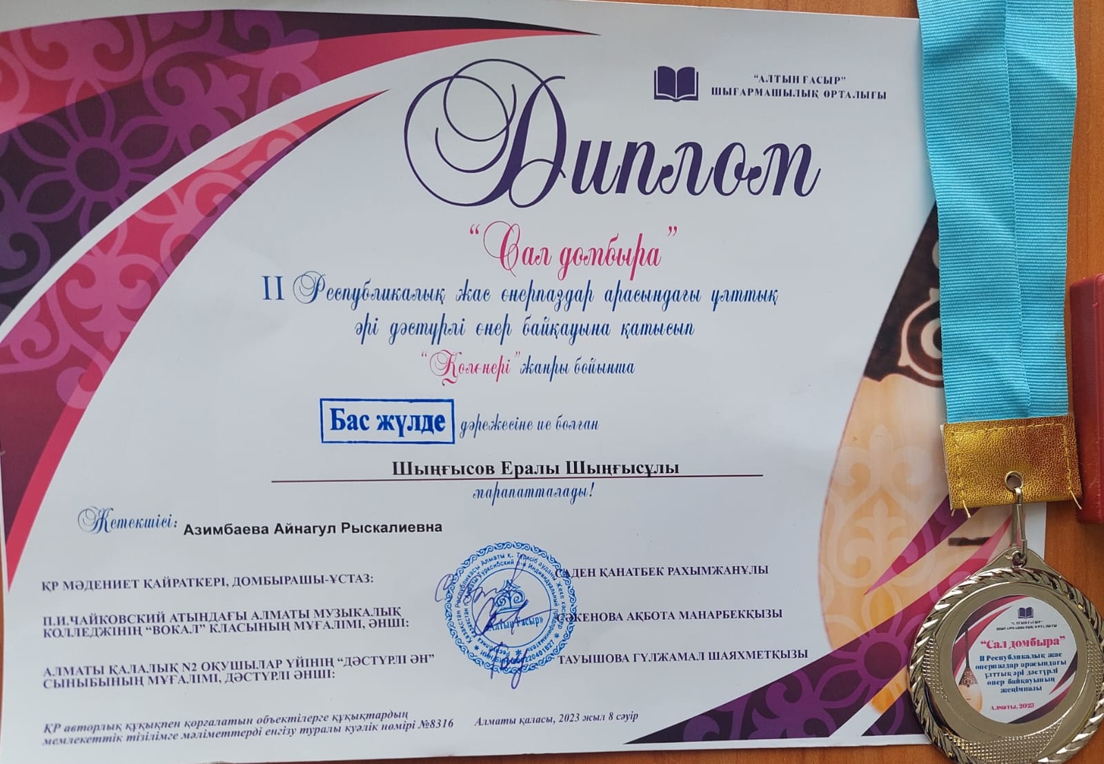 "Сал домбыра" ІІ Республикалық жас өнерпаздар арасындағы ұлттық әрі дәстүрлі өнер байқауына қатысып "Қолөнері" бағыты бойынша бас жүлде дәрежесінде диплом, кубокка ие болған 5-сынып оқушысы Шыңғысов Ералы Жетекшісі: Азимбаева Айнагул Рыскалиевна