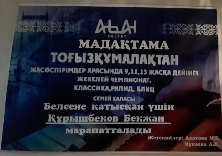 Семей қаласында өткен тоғызқұмалақтан жасөспірімдер арасында 9,11, 15 жасқа дейінгі жекелей чемпионат классика, рапид, блицте белсене қатысқаны үшін 2-сынып оқушысы Бұрышбек Бекжан марапатталды.
