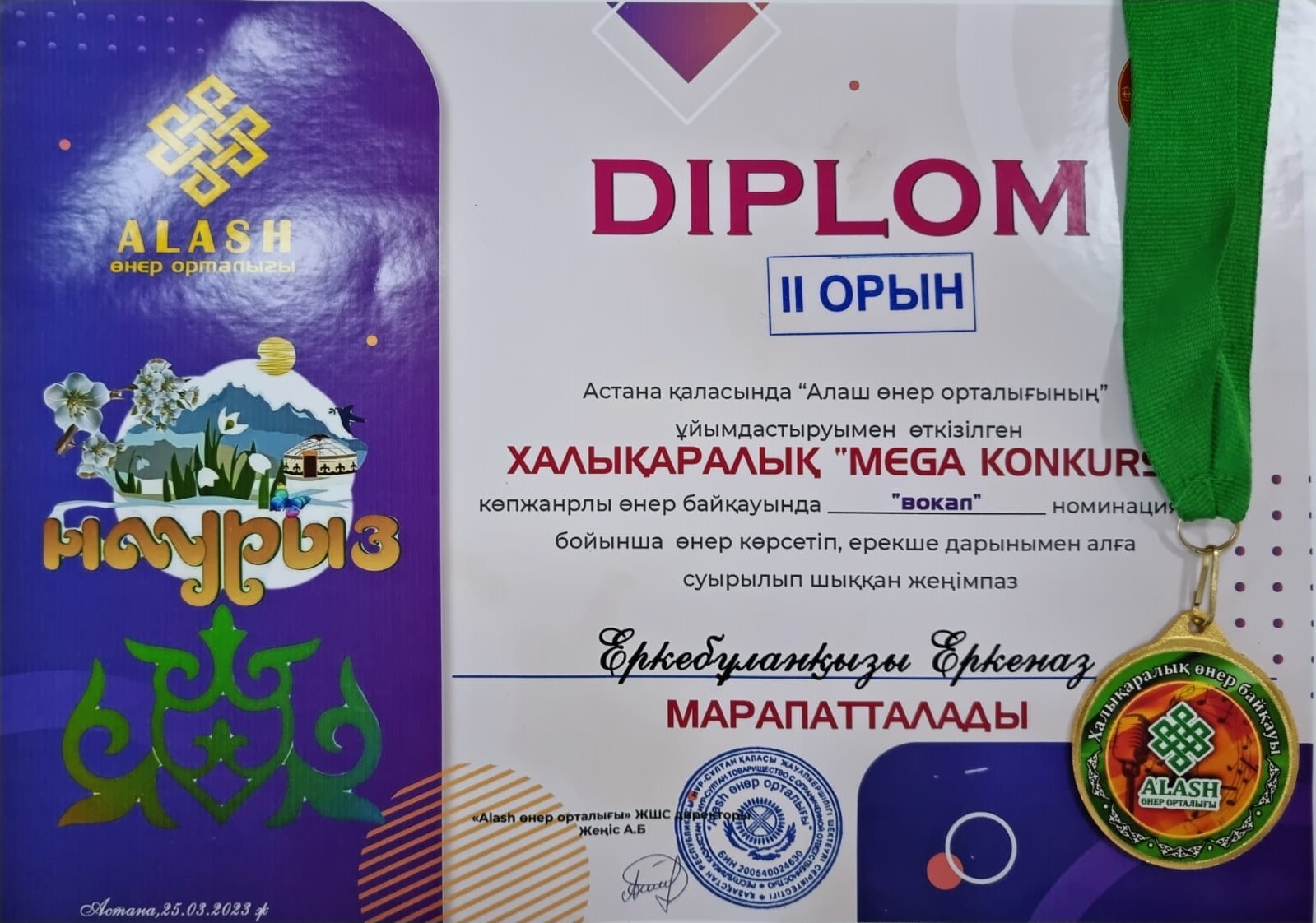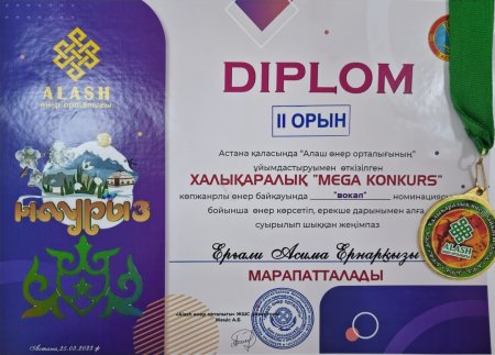 "Вокал" байқауынан 6-сынып оқушысы Еркебұланқызы Еркеназ ІІ орын