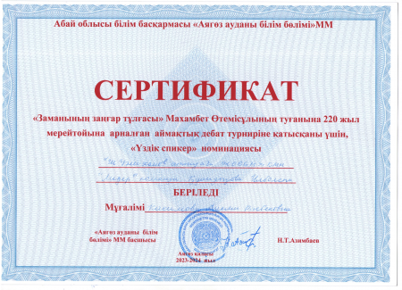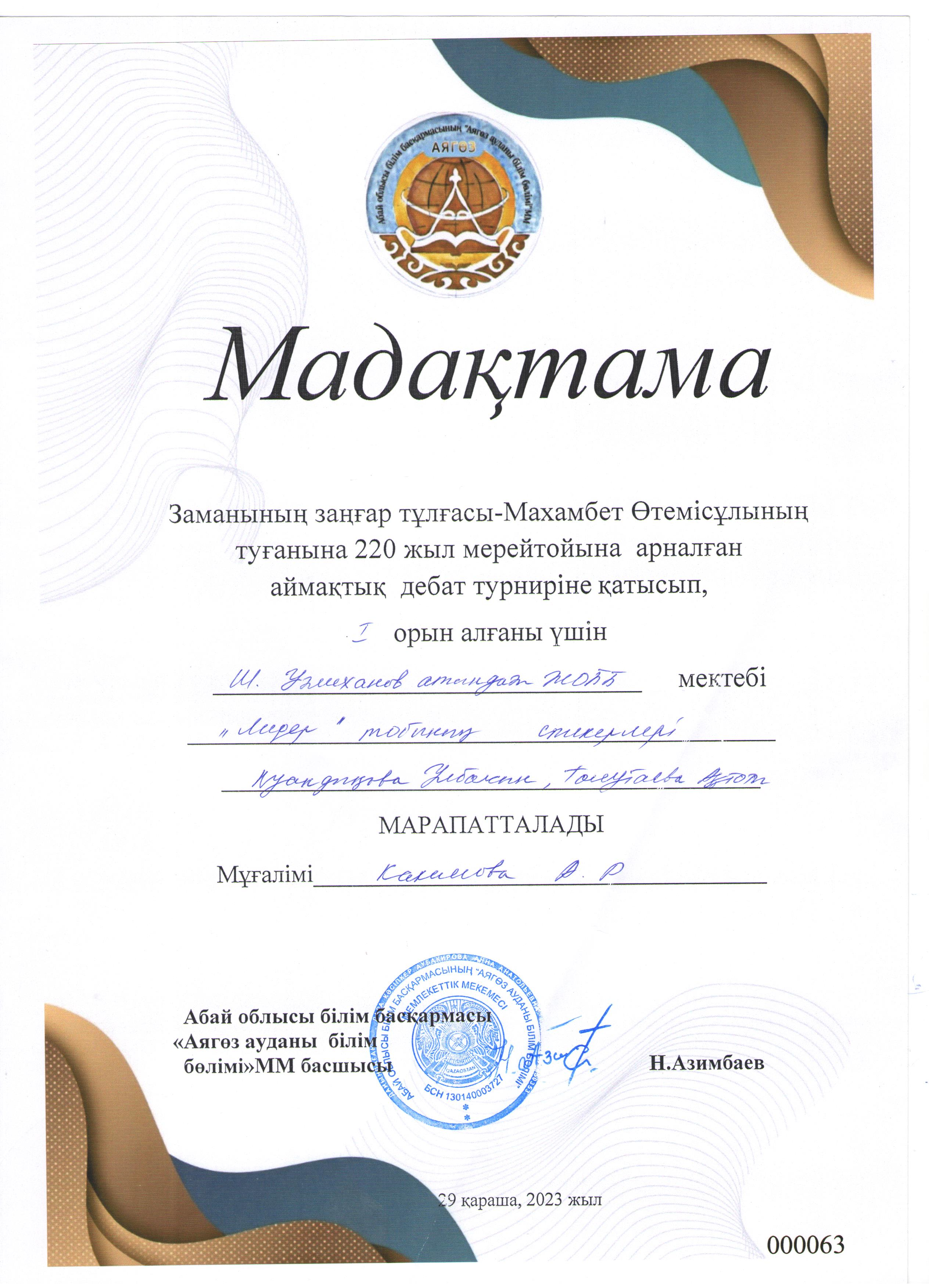 Заманының заңғар тұлғасы-Махамбет Өтемісұлының туғанына 220 жыл мерейтойына арналған аймақтық дебат турниріне "Лидер" команда қатысып І орынға ие болды.