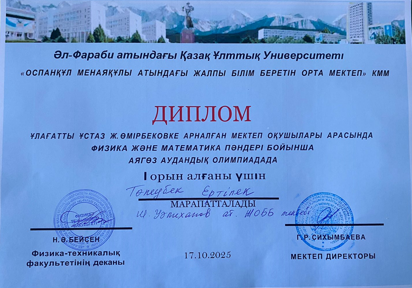 Ұлағатты ұстаз Ж.Өмірбековке арналған физика -математика пәндері бойынша аудандық олимпиада
