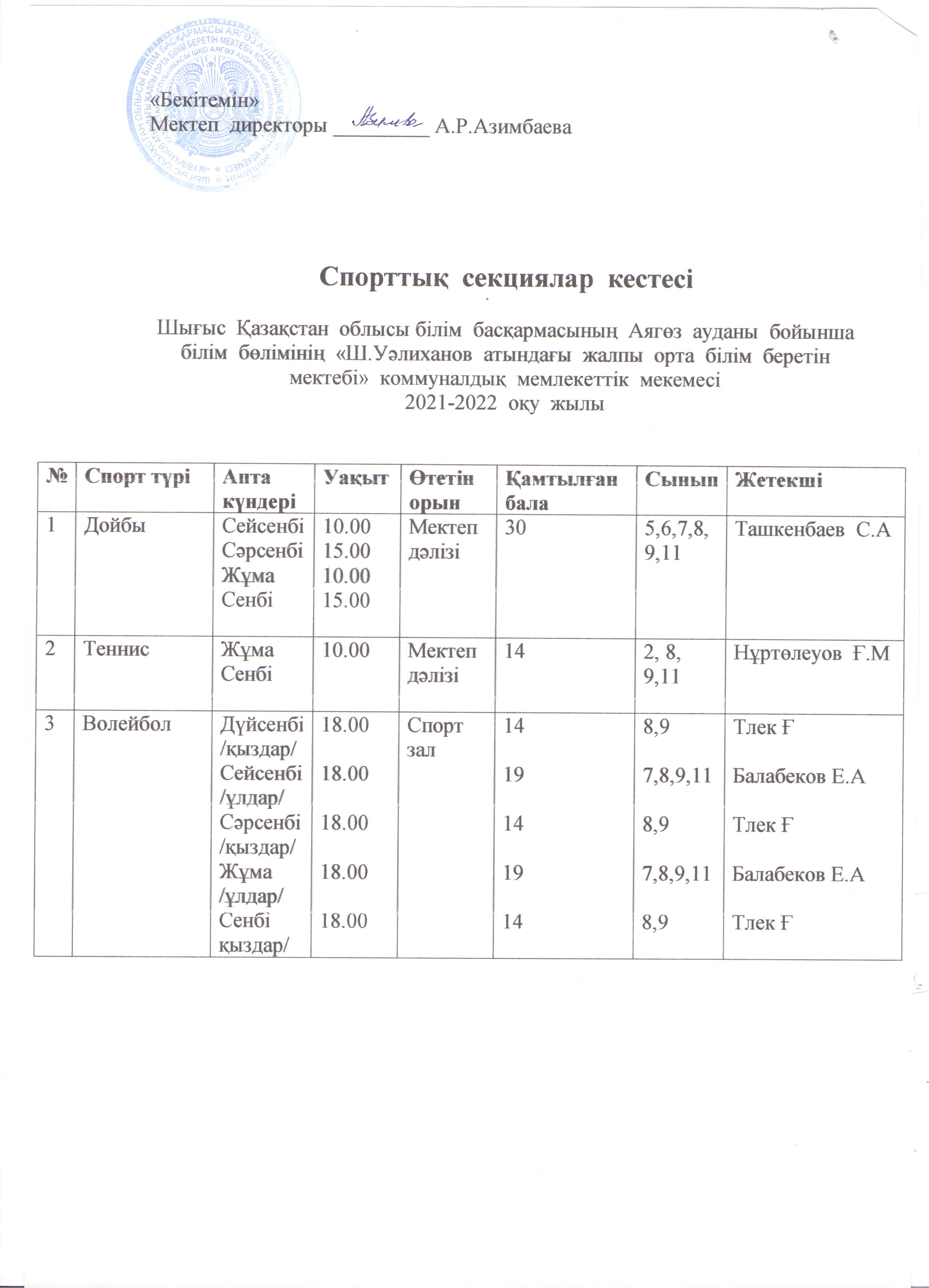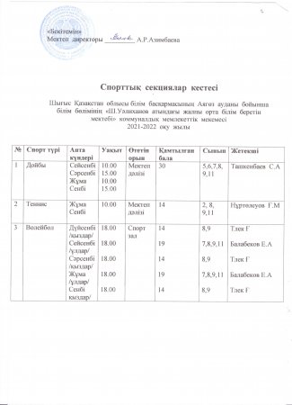 Спорттық секциялар кестесі