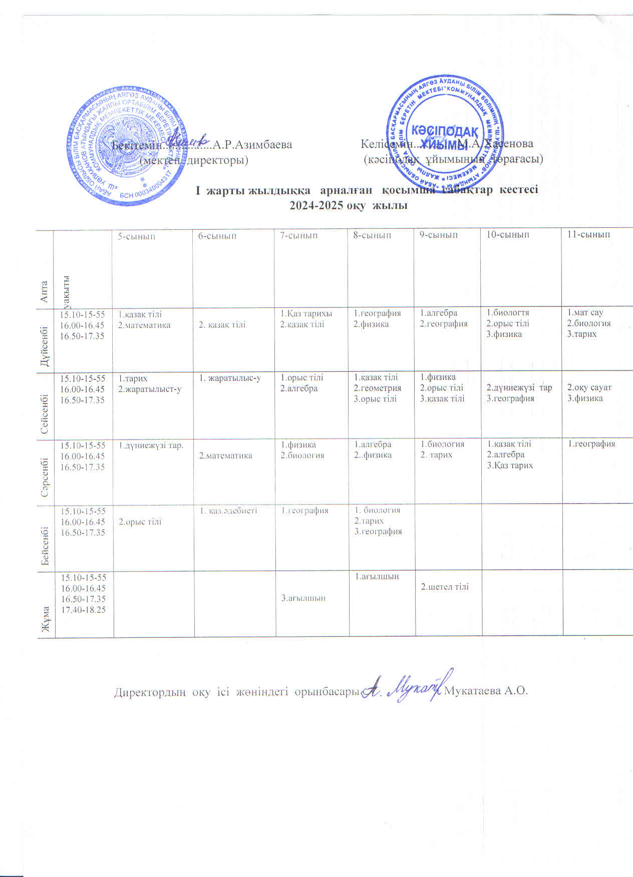 Қосымша сабақ кестесі